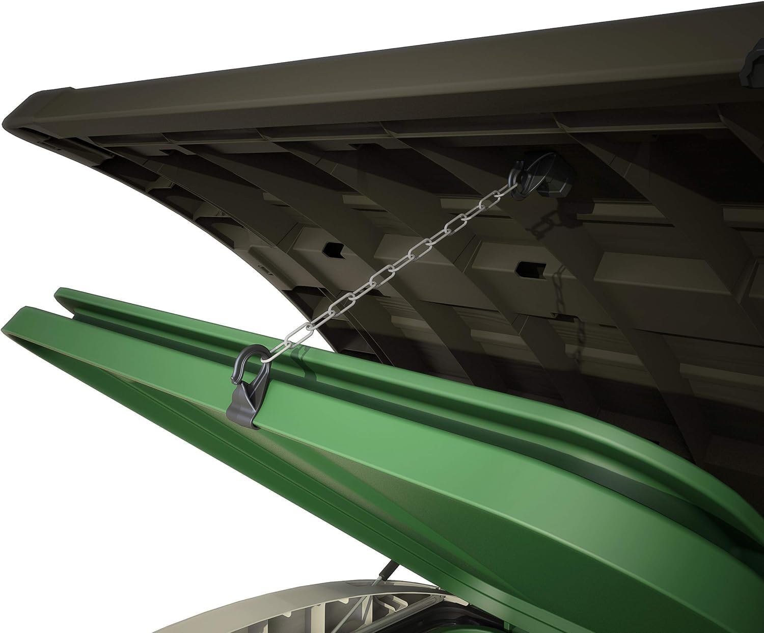 Spacious interior fits outdoor cushions, gardening tools, toys, or two small trash bins.